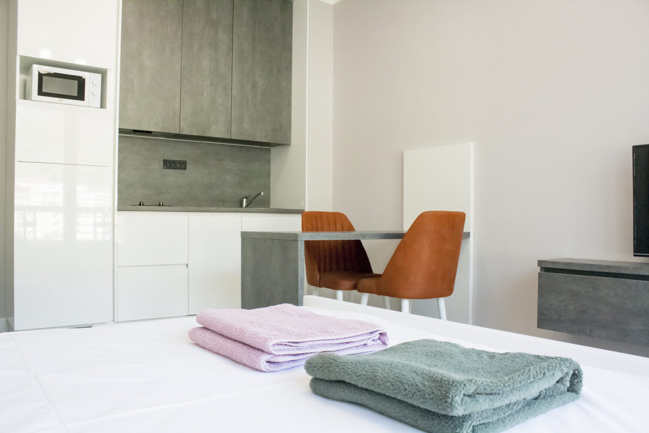 The studio features a spacious king-size bed, with a wardrobe for your belongings. The