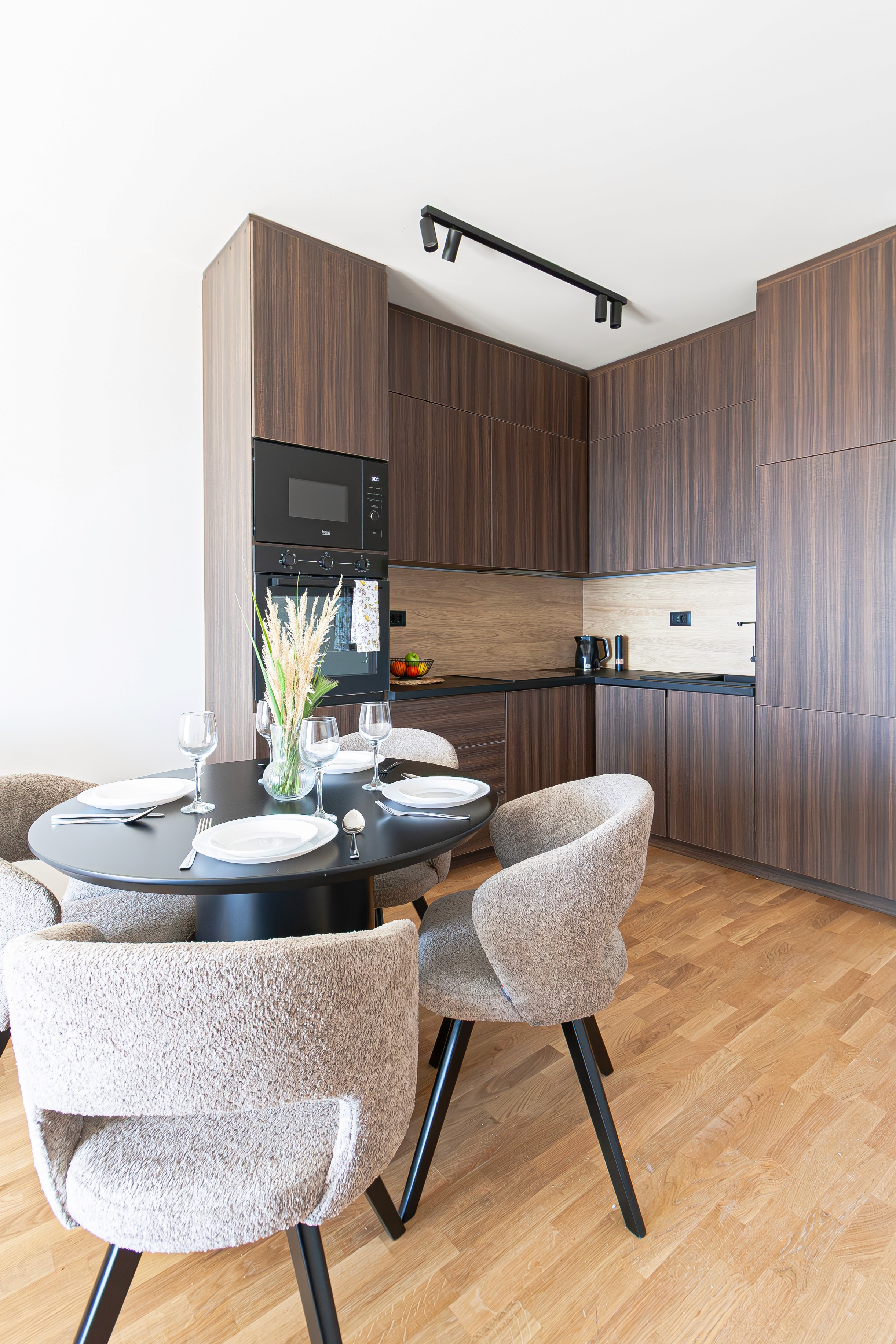 The apartment features a cozy bedroom with a double bed and wardrobe, as well as a bright living room with an unfolding corner sofa bed, providing additional sleeping space. A dining table for four makes it easy to enjoy meals or work comfortably.