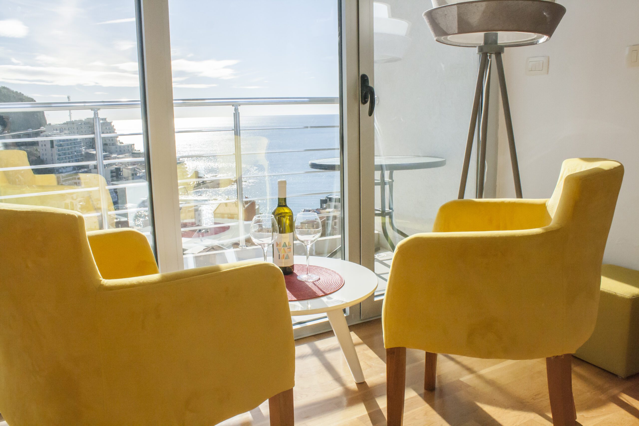 The living area features two unfolding sofas, making it suitable for up to six guests. A Smart TV provides entertainment, while large windows open to a long balcony with beautiful sea views—perfect for your morning coffee or evening relaxation.