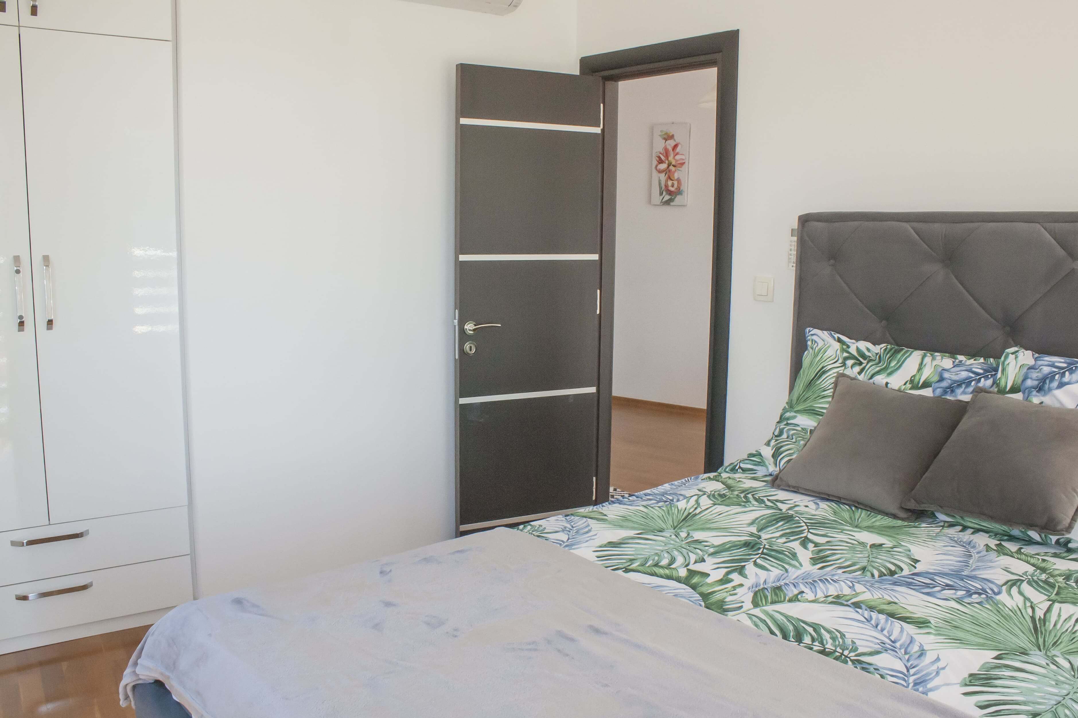 The bedroom is elegantly designed with a double bed, a spacious wardrobe, and air