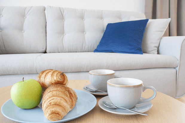 The open-plan kitchen is fully equipped with everything you need to prepare meals at home, including an induction cooktop, oven, microwave, dishwasher, coffee machine, fridge with freezer, and a full set of cookware and dining essentials. The living area is perfect for relaxing and includes a large smart TV, air conditioning, and a cozy sofa that easily unfolds into a bed for two additional guests, making the apartment suitable for up to four people.